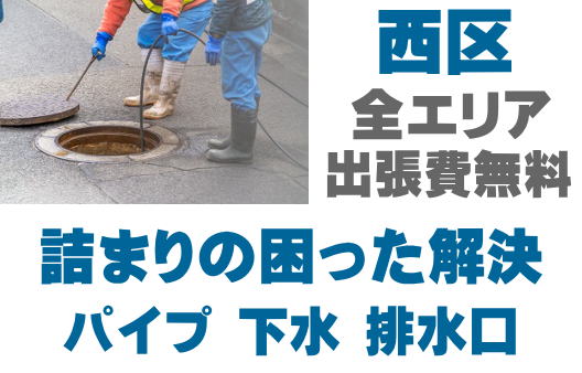 西区の水回りの詰まりを即解決!キッチン、トイレ、風呂、洗面、マンホール、雨どい、シンク、厨房、グリストなどの詰まりトラブル対応。